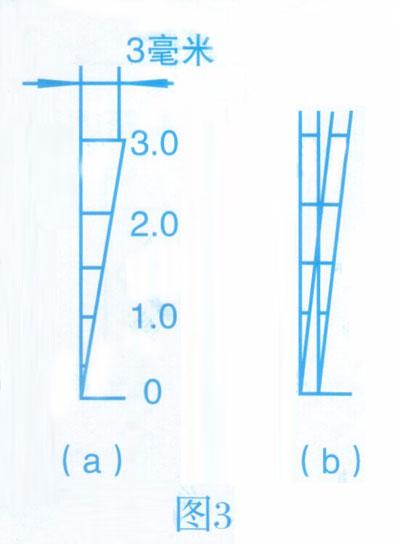 (1)振幅的測量振幅指示牌如圖3(a)所示,只是部分為一直角三角形。當指示牌與槽體一起振動是,由于視覺暫留,直角邊與斜邊形成一個交點,其交點所對應的標尺數即為被測槽體的雙振幅。當雙振幅為2毫米時,交點就對應在標尺2處,如圖3 (b)所示。